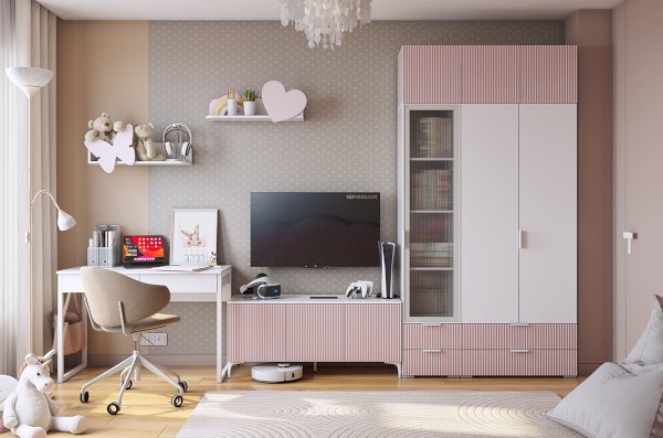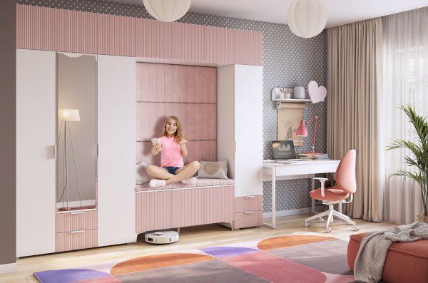 Сочетание белого дерева в корпусе и пудрово-розового оттенка на фасадах создает неповторимую атмосферу нежности и романтизма. Фрезеровка в виде вертикальных полос придает фасадам особый шарм и добавляет элементы классического дизайна.