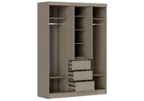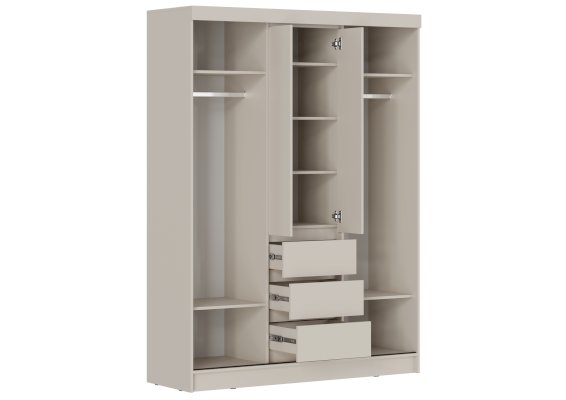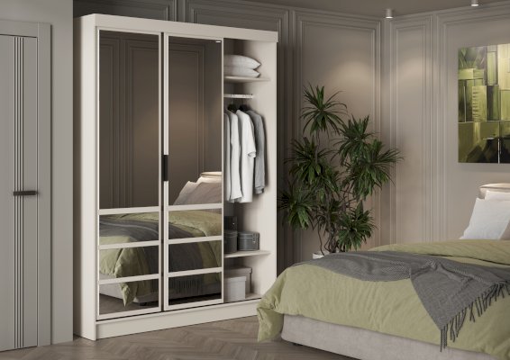 Шкаф включает отделения для верхней одежды со створками-купе на алюминиевых направляющих, обеспечивающими плавное и бесшумное открывание/закрывание. Внутри — полки, штанги для одежды и нишевые пространства для хранения белья, что позволяет организовать вещи максимально удобно.